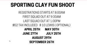 Check in at clubhouse starting at 5:30 am. Official Shooting hours start at 6:25 am